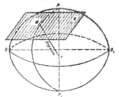Любая плоскость, проходящая через нормаль, называется нормальной плоскостью. Через нормаль можно привести бесчисленное множество нормальных плоскостей, из которых плоскость меридиана и плоскость первого вертикала являются основными.