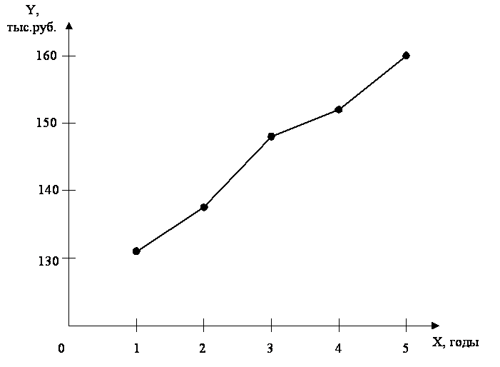 Рассмотрим пример динамики объема розничного товарооборота (рис. 4.1). Можно предположить, что розничный товарооборот торгового предприятия развивается по линейной функции: