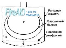 Сокращение дыхательных мышц грудной клетки и диафрагмы при вдохе вызывает увеличение объема легких, а при их расслаблении во время выдоха легкие спадаются до исходного объема. Объем легких как при вдохе, так и при выдохе изменяется пассивно, поскольку благодаря своей высокой эластичности и растяжимости легкие следуют за изменениями объема грудной полости, вызванными сокращением дыхательных мышц. Это положение иллюстрирует следующая модель пассивного увеличения объема легких (рис. 10.3). В этой модели легкие могут быть рассмотрены в качестве эластичного баллона, помещенного внутрь емкости, выполненной из ригидных стенок и гибкой диафрагмы. Пространство между эластичным баллоном и стенками емкости является герметичным. Эта модель позволяет изменять давление внутри емкости при движении вниз гибкой диафрагмы. При увеличении объема емкости, вызванном движением вниз гибкой диафрагмы, давление внутри емкости, т. е. вне баллона, становится ниже атмосферного в соответствии с законом идеального газа. Баллон раздувается, поскольку давление внутри него (атмосферное) становится выше, чем давление в емкости вокруг баллона.
