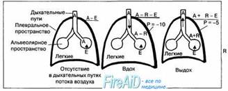 Пневмоторакс. Если воздух входит во внутриплевральное пространство, например через раневое отверстие, в легких возникает коллапс, грудная клетка незначительно увеличивается в объеме, а диафрагма опускается вниз, как только внутриплевральное давление становится равным атмосферному давлению. Это состояние называется пневмотораксом, при котором легкие утрачивают способность следовать за изменением объема грудной полости во время дыхательных движений. Более того, во время вдоха воздух через раневое отверстие входит в грудную полость и выходит во время выдоха без изменения объема легких во время дыхательных движений, что делает невозможным газообмен между внешней средой и организмом.