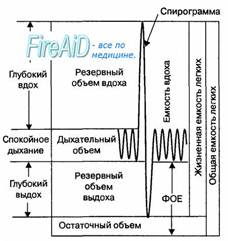 Рис. 10.5. Объемы и емкости воздуха в легких и кривая (спирограмма) изменения объема воздуха в легких при спокойном дыхании, глубоком вдохе и выдохе. ФОЕ — функциональная остаточная емкость.