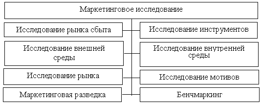 Объектом маркетинговых исследований может быть любой элемент комплекса маркетинга, а также любой фактор, могущий оказать на него влияние. Поэтому маркетинговое исследование может проводиться по следующим направлениям: исследование рынка сбыта, исследование внутренней среды предприятия, разработка эффективного использования маркетингового инструментария, исследование внешней среды, организация исследований на основе бенчмаркинга и проведение маркетинговой разведки (рис. 5).