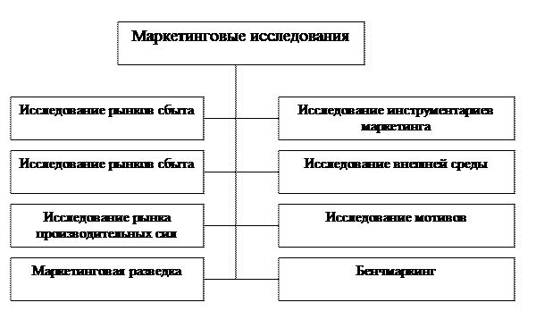 Таким образом, маркетинговое исследование включает исследование рынка сбыта, исследование внутренней среды фирмы, исследование маркетингового инструментария, его эффективности использования, исследование рынка производственных сил (рабочая сила, сырье и материалы, денежный рынок, рынок капитала), исследование внешней среды, организацию исследований на основе бенчмаркинга и проведение маркетинговой разведки, исследование мотивов.
