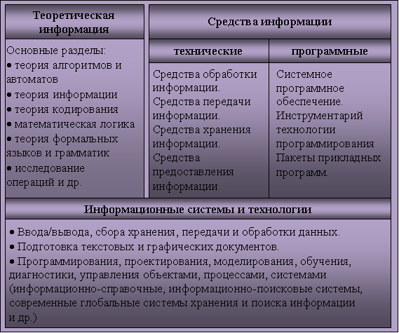 Теоретическая информатика – часть информатики, занимающаяся изучением структуры и общих свойств информации и информационных процессов, формированием основных принципов разработки информационной техники и технологии. Строится теория информатики на использовании математических методов и содержит такие основные математические разделы, как теория алгоритмов и автоматов, теория информации и теория кодирования, теория формальных языков и грамматик, исследование операций и др.