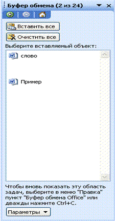 Необхідні елементи управління знаходяться в області завдань Буфер обміну (мал. 5), який з'являється, якщо дати команду Правкабуфер обміну,або двічі підряд помістити елементи в буфер обміну, не витягуючи з нього.