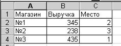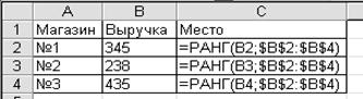 Если признак сортировки отсутствует, то о Excel определяет ранг числа так, как если бы ссылка была списком, отсортированным в порядке убывания, а если присутствует (отличное от нуля число) – в порядке возрастания. На рис. 6.2 представлен пример применения функции РАНГ. Для трех магазинов необходимо определить занимаемое место по полученной выручке ( в порядке убывания). Обратить внимание (при копировании С2 в С3:С4 ) на абсолютные адреса ячеек ссылки в команде = РАНГ ( B2; $B$2 : $B$4 ) .