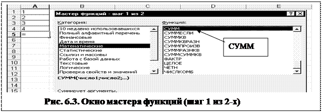 1. Активизировать ячейку А5 и в панели Excel щелкнуть кнопку fx Вставка функции. Открывается окно Мастер функций - шаг 1 из 2 (рис. 6.3).