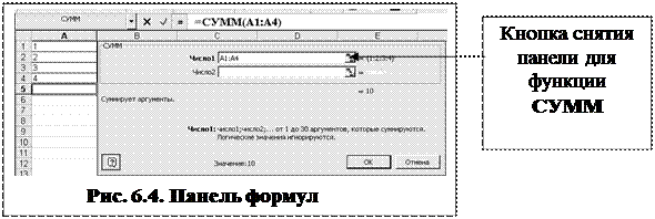 3. Появляется панель формул для функции СУММ(рис. 6.4). В поле число 1 набрать с клавиатуры диапазон А1:А4. Функция готова. Ее можно увидеть в строке формул. Обратите внимание, что справа окошка число 1 расположены суммируемые числа, а ниже (справа) результат. Остается щелкнуть кнопку ОК.Мастер функций закрывается.