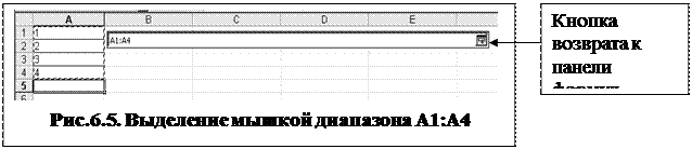 Примечание. В панели формул гораздо удобнее не набирать с клавиатуры диапазон А1:А4 , а щелкнуть справа по кнопке снятия панели для функции СУММ (рис. 6.4). Панель снимается, а вместо ее остается небольшая полоска с копкой возврата (рис. 6.5). Выделить мышкой диапазон А1:А4 и щелкнуть по кнопке возврата. В панели формул щелкнуть ОК. Мастер функций закрывается, в строке формул отражается формула, а в ячейке А5 числовой результат.