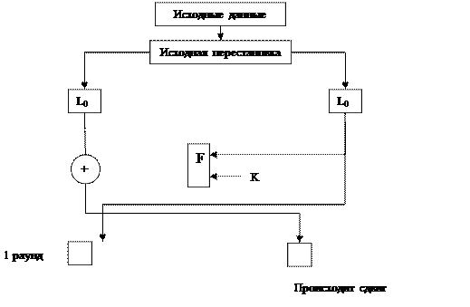 Разбиваем на две 32-х битовые части. Одна L, другая R. С ними проводим 16 раундов преобразования.