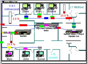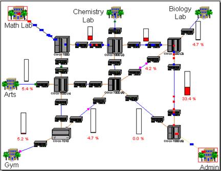 Вы увидите динамическую картину рис. 3.1. Если необходимо посмотреть работу сети на более подробно, то щелкните левой кнопкой мыши на на зданиях Admin и Math Lab(рис. 3.2).