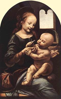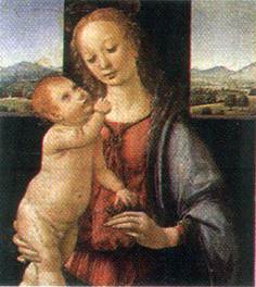 Мадонна с младенцем (Мадонна Бенуа ). 1478. Холст, масло. Размер: 49,5 х 33 см. Государственный Эрмитаж, Санкт-Петербург.