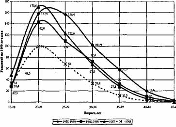 Повозрастные коэффициенты рождаемости. Россия, 1958-1998 гг.