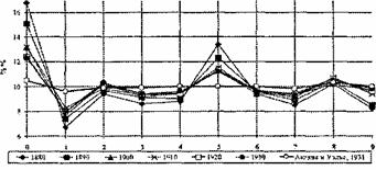 Помимо сказанного, график 3.6 показывает и зависимость возрастной аккумуляции от упоминавшегося выше культурного уровня населения. Перепись 1931 г. в Англии практически не выявила никакой возрастной аккумуляции, в то время как в США по усредненным за 50 лет данным величина ее весьма существенна: индекс Мьерса, измеряющий величину аккумуляции, в США почти в 8 раз больше, чем в Англии (12,2 против 1,6). Еще больше эти отличия для переписей населения США, проведенных в конце XIX столетия: в 1880 г. величина упомянутого индекса составляла 20,8, а в 1890 г. - 15,6. Этот индекс равен сумме абсолютных значений отклонений долей населения в каждом из возрастов, оканчивающихся на «0», «1»,..., «9», от 10%.