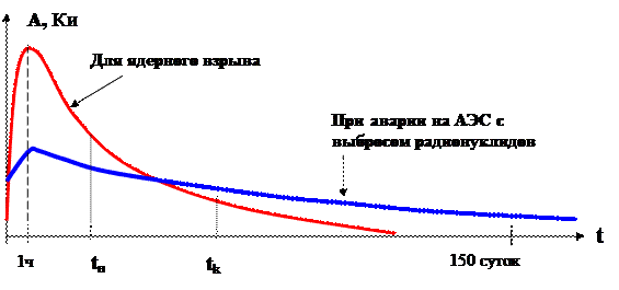 При аварии на АЭС с выбросом радионуклидов из активной зоны количество и состав радионуклидов будет другим. Обычно, количество радионуклидов не превышает 40 -50, так как большинство короткоживущих радионуклидов в реакторе уже распалось. Но происходит накопление радионуклидов, период полураспада которых соизмерим со сроком жизни человека и более. Кроме того, количество ядерного горючего в атомном реакторе измеряется тоннами, в то время как масса ядерного взрывчатого вещества боеприпаса исчисляется килограммами. По этой причине количество выброшенных радионуклидов при аварии может быть значительным, а время распада большим. На рис. 1.3. можно сравнить законы спада радиоактивности для ядерного взрыва и после аварии на АЭС с выбросом радиоактивных веществ.