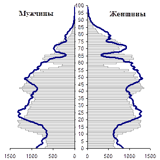 Численное превышение женщин над мужчинами в составе населения отмечается с 29 лет и с возрастом увеличивается. Такое неблагоприятное соотношение сложилось из-за сохраняющегося высокого уровня преждевременной смертности мужчин.