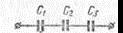 При последовательном соединении конденсаторов: а) напряжения складываются, б) заряды одинаковы, в) складываются величины, обратные емкости.