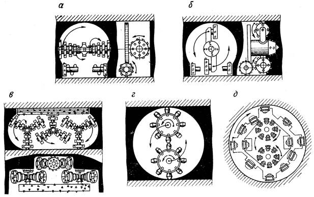 Параллельно-осевые исполнительные органы (рис.2, г-з) предназначены для работы по углю и мягким породам и состоят из двух планшайб, смонтированных на отдельных встречно вращающихся приводных валах. Такое расположение позволяет уравновесить планшайбы и обеспечить подгребание отбитой горной массы к центру выработки для погрузки на скребковый конвейер.