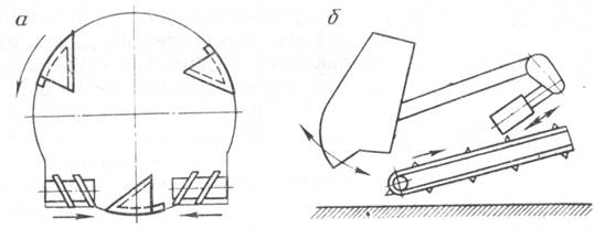 Ковшовые погрузочные устройства (рис.4и табл.2) в основном нашли применение на комбайнах бурового типа. Ковши, расположенные по окружности на максимальном радиусе планшайбы роторного исполнительного органа (рис.4, а), обеспечивают фронт погрузки, равный диаметру проводимой выработки. Горная масса, разрушенная инструментом исполнительного органа, зачерпывается 3 вращающимися ковшами у почвы выработки. В верхнем положении ковши разгружаются в разгрузочное окно и течку.