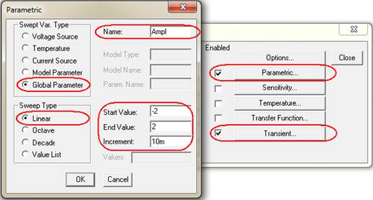 ) Transient...с параметрами: Print Step=1ns; Final Time=1ms, Step Ceiling=1us. Установить также режим PARAMETRIC со следующими параметрами: Global Parameter; Linear; Name = Ampl; для каскада ОЭ – Start Value = – 2V; End Value = 2V; Increment = 10mV (Рис. 6); для каскада ОК – Start Value = – 5V; End Value = 5V; Increment = 50mV;