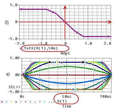 ) и получить набор графиков напряжения выходного сигнала. Если участок с нелинейными искажениями выходного сигнала не достигнут, необходимо увеличивать значения Start Value, End Value и Increment до тех пор, пока искажения не появятся. При запросе системы о выборе графика для вывода на экран нажать OK.
