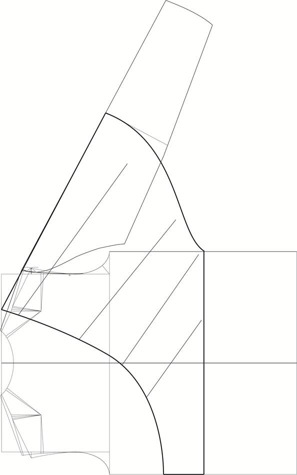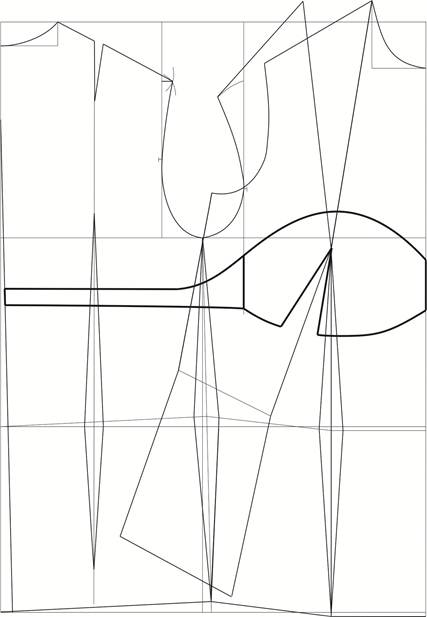 Найден наклон горловины, горловина углублена на 20см, расширенная на 4см. Нагрудная вытачка методом технического моделирования сокращена на 1/3, остаток распределён в линию проймы и горловины. Линия нижнего среза рукава окончательно сформирована при помощи макетирования. Методом макетирования найдена глубина от 1см до 6см и положение складок. Длина изделия 45см.