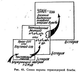 Термоядерный боеприпас (бомба) содержит в себе все части ядерной бомбы, а, кроме того, термоядерный заряд и природный уран 238 (в корпусе бомбы). Взрыв термоядерной бомбы происходит в три стадии (трехступенчатая бомба) на основе реакций деление - синтез—деление;