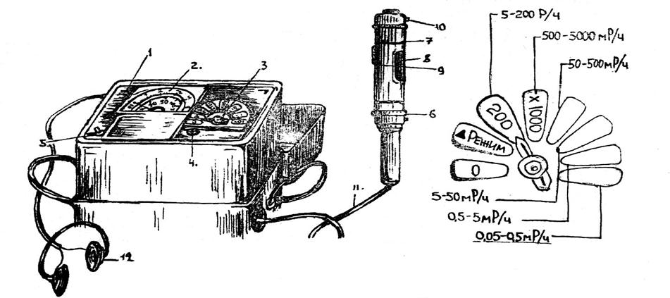 | 1.Панель пульта.2.Микроамперметр с 2-мя шкалами (мР/ч и Р/ч).3.Переключатель поддиапазонов.4.«Сброс».5.Подсвет шкалы.6.Зонд (детектор).7.Поворотный экран.8.Окошечко зонда.9.Контрольный радиоактивный препарат (Sr90).10.Опорные выступы.11.Кабель зонда.12.Телефонные наушники. |