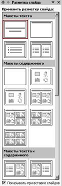 При выборе данного пункта будет создан новый слайд. Для которого можно будет выбрать автомакет. При создании нового слайда с помощью этого пункта будет отображено окно Создания слайда. В этом окне в области задач следует выбрать макет создаваемого слайда и щелкнуть на нем.