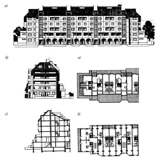 а , б - фасады здания; в -фрагмент плана мансардного этажа; г - поперечный разрез; д -фрагмент планов 3-5 этажей