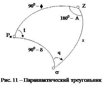 Параллактический треугольник – сферический треугольник с вершинами Pn, Z, s (рис. 11). Он образован пересечением трех больших кругов: небесного меридиана, круга склонения и вертикала светила.