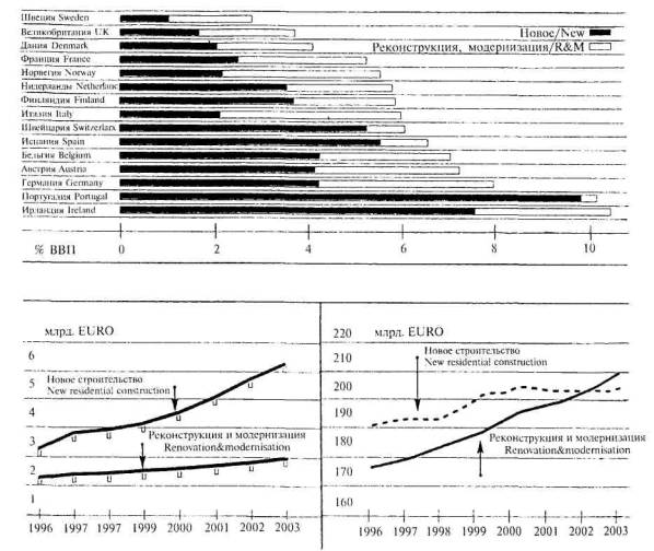 Доля затрат на реконструктивные работы достаточно высока. Эти данные подтверждаются многолетним опытом Скандинавских стран (Швеция - 40 %, Финляндия - 51 %), Центральной Европы (Франция - до 60 %,Германия - 30-40 %, Великобритания - до 60 %). Центр тяжести затрат, как правило, переносится на жилищные объекты как наиболее массовые и в меньшей степени на здания общественного и административного назначения.