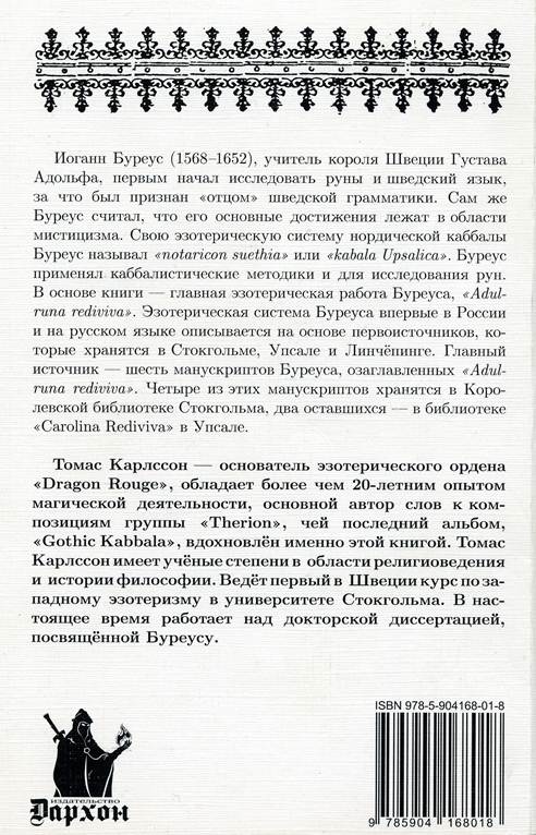 Иоганн Буреус (1568-1652), учитель короля Швеции Густава Адольфа, первым начал исследовать руны и шведский язык, за что был признан «отцом» шведской грамматики. Сам же Буреус считал, что его основные достижения лежат в области мистицизма. Свою эзотерическую систему нордической каббалы Буреус называл «notaricon suethia» или «Kabala Upsalica». Буреус применял каббалистические методики и для исследования рун. В основе книги — главная эзотерическая работа Буреуса «Adulruna rediviva». Эзотерическая система Буреуса впервые в России и на русском языке описывается на основе первоисточников, которые хранятся в Стокгольме, Упсале и Линчёпинге. Главный источник — шесть манускриптов Буреуса, озаглавленных «Adulruna rediviva». Четыре из них хранятся в Королевской библиотеке Стокгольма, два оставшихся — в библиотеке «Carolina Rediviva» в Упсале.
