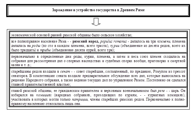 Для «Царского» периода Древнего Рима (753 г. до н.э.) характерен процесс разложения первобытнообщинного строя племен, обосновавшихся у реки Тибр. Объединение путем войн трех племен (древних латинян, сабинян и этрусков) привело к образованию в Риме общины. Рим в эту пору был догосударственным образованием с элементами военной демократии (сх. 14).