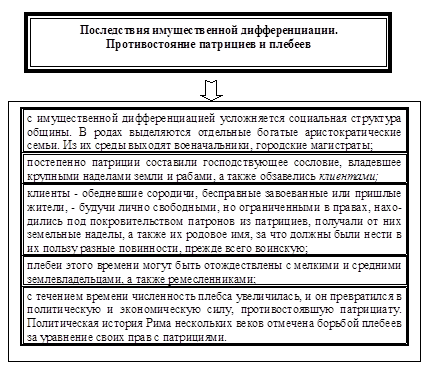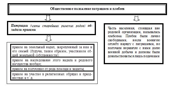 Другая часть населения, стоявшая вне родовой организации, называлась плебеями. Плебеи были лично свободными гражданами Рима, несли военную службу наряду с патрициями, но получали не равную с ними долю военной добычи и в «царский» период были полностью лишены политической правоспособности (сх. 15).