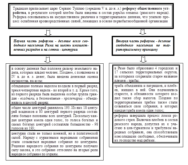 Реформа Сервия Туллия завершила процесс ликвидации основ родового строя. Включив плебеев в состав полноправного римского народа и допустив их к участию в центуриатном и трибутном народных собраниях, реформа способствовала консолидации свободных и обеспечила их господство над рабами (Это представлено в предлагаемой схеме 17).