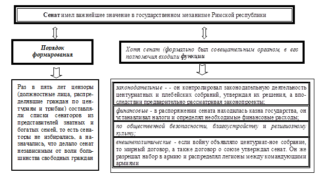Самое важное значение в государственном механизме Римской республики играл сенат. Раз в пять лет цензоры (специальные должностные лица, распределявшие граждан по центуриям и трибам) составляли списки сенаторов из представителей знатных и богатых семей, то есть сенаторы не избирались, а назначались, что делало сенат органом, не зависимым от воли большинства свободных граждан (сх. 21).
