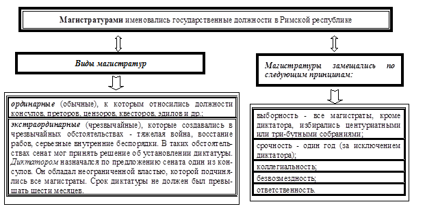 Высшими государственными органами в Римской республике являлись народные собрания, сенат и магистратуры (сх. 19).