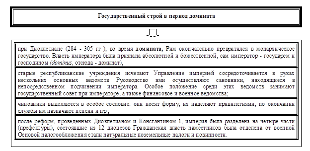 Первоначально наказание строилось на принципе возмездия. В период домината оно также преследует цели устрашения, причем в императорском Риме происходит усиление карательной направленности наказания и резкое увеличение числа его видов: