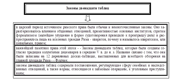 Законы XII таблиц, считаются важнейшим памятником права. Они были созданы коллегией децемвиров (ученых мужей) в середине V в. до н.э. Название связано с тем, что они были записаны на 12-ти досках-таблицах, выставленных для всеобщего обозрения на главной площади Рима - - Форуме. Законы XII таблиц содержали постановления, регулирующие сферу процессуальных, семейных и наследственных отношений, а также нормы, относящиеся к займовым операциям, к уголовным преступлениям (сх. 26).