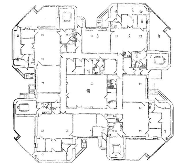 1 - раздевальная; 2 - групповая; 3 - спальня; 4 - туалетная; 5 - буфетная; 6 - помещение для занятий по подгруппам; 7 - ванна-бассейн; 8 - остекленная веранда; 9 - открытая терраса; 10 - зал для музыкальных и гимнастических занятий; 11 - служебно-бытовые помещения