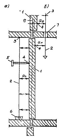 Рис. 2. Определение соосности (б) и отклонений стен от вертикали (а) с помощью вертикального отвеса