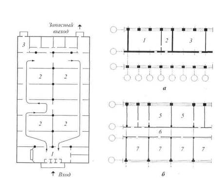 | Рис. 2.2. Анфиладная схема планировки: 1 — вестибюль; 2 — выставочные помещения; 3 — служебные помещения | Рис. 2.3. Коридорная схема планировки: а — с односторонним расположением помещений; б — с двусторонним; 1,3 — основные помещения (классы); 2 — лаборатория; 4, 6 — коридоры; 5 — кабинеты; 7 — рабочие комнаты |
