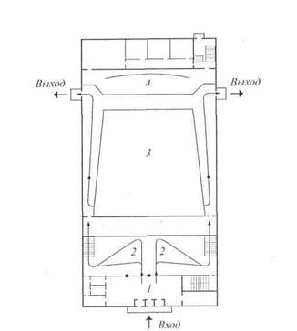 Рис. 2.4. Зальная схема планировки: 1 — вестибюль; 2 — фойе; 3 — зрительный зал; 4 — эстрада