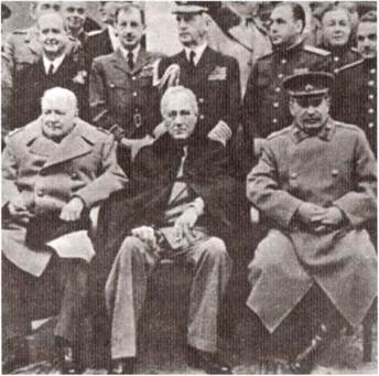 У. Черчилль, Ф. Рузвельт, И. В. Сталин (слева направо) на Крымской конференции в Ялте. Февраль 1945 г