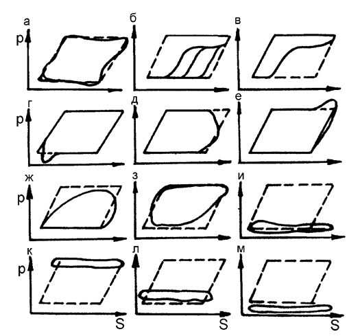 а - нормальная тихоходная работа; б - влияние газа; в – превышение подачи насоса над притоком в скважину; г - низкая посадка плунжера; д - выход плунжера из цилиндра невставного насоса; е – удары плунжера о верхнюю ограничительную гайку вставного насоса; ж - утечки в нагнетательной части; и - полный выход из строя нагнетательной части; к ‑ полный выход из строя всасывающей части; л - полуфонтанный характер работы насоса; м ‑ обрыв штанг (пунктиром показаны линии теоретической динамограммы); з - утечки во всасывающей части