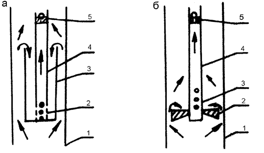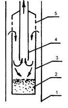 1 – эксплуатационная колонна, 2 – слой накопившегося песка, 3 –корпус, 4 – приемная труба,5 – отверстия для ввода смеси в якорь.