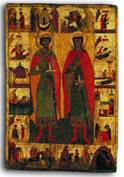 1. Святые Борис и Глеб с житием. Икона из Борисоглебской церкви в «Запрудах» в Коломне. Конец XIV в. (ГТГ)