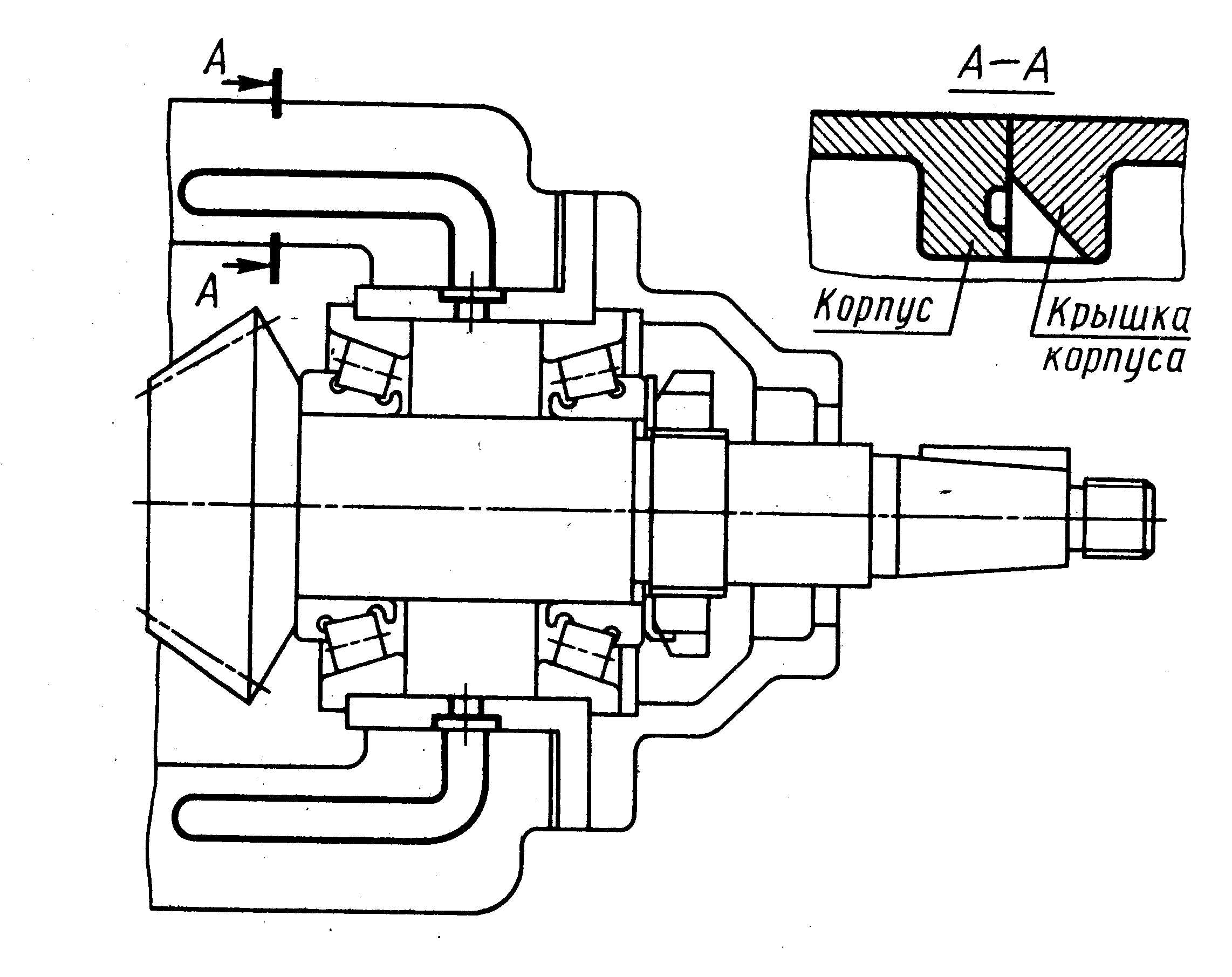 Для смазывания опор валов, далеко расположенных от уровня масляной ванны, применяют различные устройства. Так, для смазывания подшипников вала конической шестерни, удаленных от масляной ванны, на фланце корпуса в плоскости разъема делают канавки, а на крышке корпуса скосы (рис.2.38 (рис 11.5 ??)) В канавки со стенок крышки корпуса стекает разбрызгиваемое колесом масла и через отверстия в стакане попадает к подшипникам.