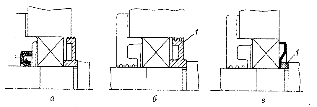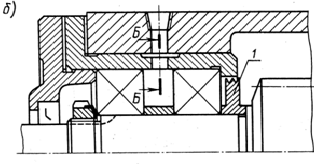 v ≤ 2 м/c. Полость подшипника, смазываемого пластичным материалом, должна быть закрыта с внутренней стороны подшипникового узла внутренним уплотнением (кольцо 1) (рис.2.39)